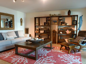This three-bedroom, two-bathroom home is fully equipped and ideal for families or groups. The spacious, ocean-themed unit offers stunning direct ocean views and features a local art collection alongside high-quality furnishings. Each bedroom includes a queen-size bed and a futon (floor mattress), with additional day beds, comfortably accommodating up to 8 guests.