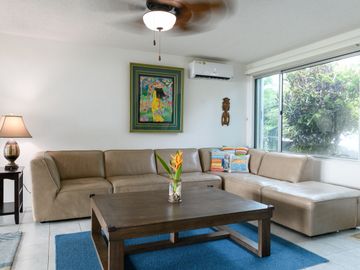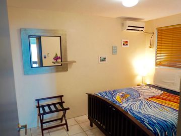 This charming one-bedroom unit offers a private entrance right beside our mango tree. The surfer-themed space boasts direct ocean views, a large outdoor patio that serves as a barbecue terrace with a gas grill, a spacious, fully equipped kitchen, and high-quality furnishings. It includes a queen-size bed in the bedroom and a queen-size pull-out sofa in the spacious living room. A futon (floor mattress) is also available in the bedroom closet. The unit accommodates up to 4 guests.